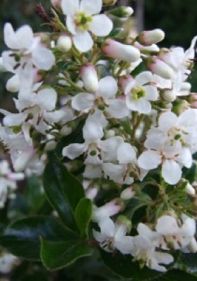 An upright evergreen shrub with glossy, dark green leaves. Large panicles of pure white fragrant flowers, contrasting well with the dark leaves. Flowers from late summer to autumn. attractive to bees and butterflies. not very hardy for cold inland areas, but good for maritime conditions if not too exposed. Prefers a sunny site with good drainage. Height approximately 1.5 metres