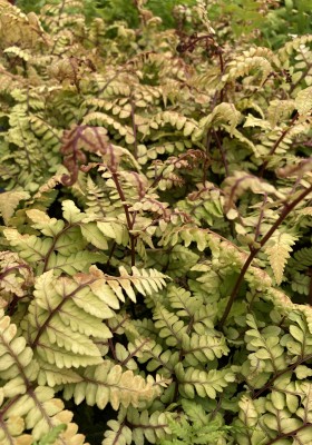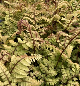 Deciduous, clump-forming fern growing to 80cm tall. The broad, arching bipinnate leaves are a light yellow-green colour with contrasting dark purple-red stalks and midribs
