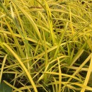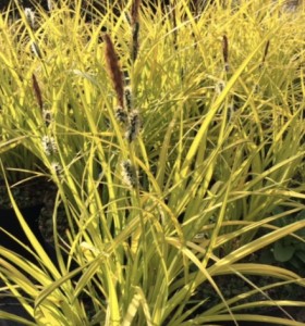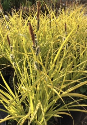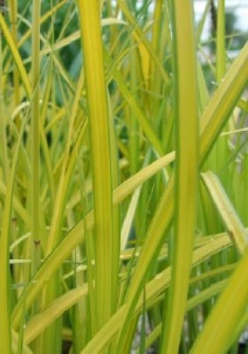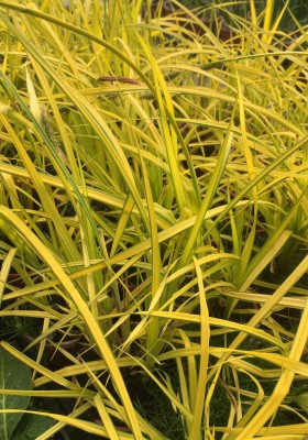 Very bright golden yellow leaves with narrow green edges. Dark brown flowers pikes above leaves in early summer. The foliage dies back in the winter. Tolerant of wet or moist soils. Grow in sun or partial shade. Height 60 cm.