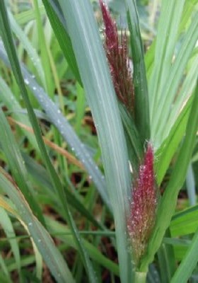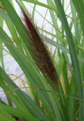 Black Fountain Grass. Dark green leaves. Long arching purple/black flower spikes in autumn with seed heads that last into winter. Height of stems 30-60 cm.