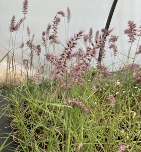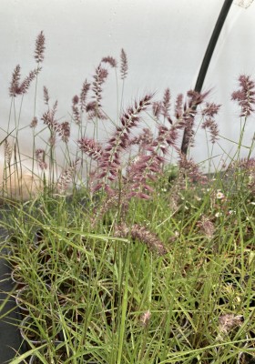 Karley Rose' is a clump-forming, perennial grass, to 60cm in height, with arching, linear leaves and hairy, narrow, silvery rose-pink panicles, 10-14cm in length, like soft bottle-brushes.