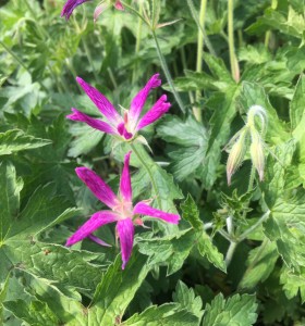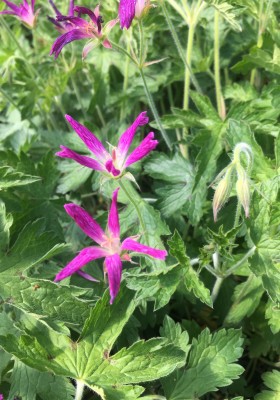A vigorous perennial with light green, 5-lobed leaves and pink to purple flowers 2.5cm wide, sometimes double, and with very narrow petals