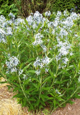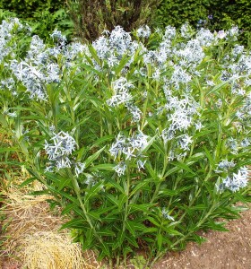 Very pretty clump forming with dark green willow like leaves and open clusters of star-shaped pale blue flowers from late spring to midsummer.