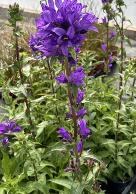 Upright stems of large, impressive clusters of rich royal blue bell-shaped flowers, from June until August. Prefers full sun, or partial shade with free-draining, but moist soil or compost. Makes an excellent mid border plant or can be used in a container at least for the first year.