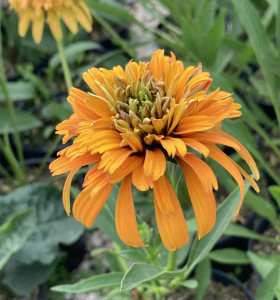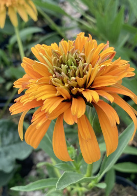 A clump-forming, upright perennial to around 65cm tall with roughly hairy foliage. Double flowers borne from early summer have drooping, pale yellowish-orange ray florets topped with large, rounded, pompom-like cones with darker orange disc florets
