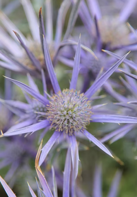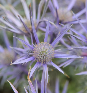 An herbaceous perennial to 45cm tall, with deeply lobed and silver-veined leaves, and vivid blue, branched stems bearing cone-like flower-heads with narrow, spiny, usually silvery-blue or violet bracts.