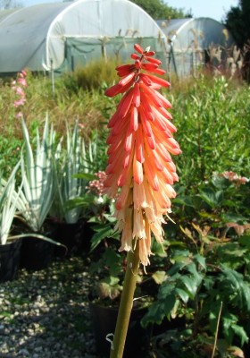 Smaller growing to Kniphofia to approximately 60 cm. Narrow leaf, coral pink and cream flowers. Flowers in late summer and early autumn. Flower heads are fairly narrow. A nice cultivar that needs moist soil with good drainage. Plant in a sunny or partially shady position.