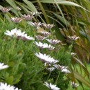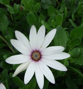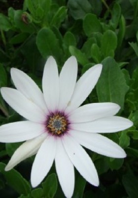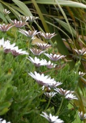 Vigorous trailing habit. White flower with a blue centre, reverse brown/tinged blue. Less hardy than Blue Streak.
