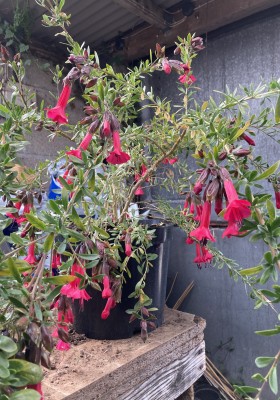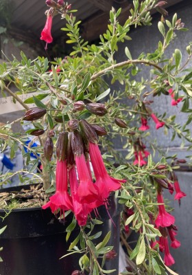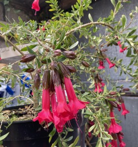 Very attractive and unusual upright, often half-climbing, evergreen shrub. In spring it produces sprays of hanging tubular flowers which are pink to purple with red petal lobes
