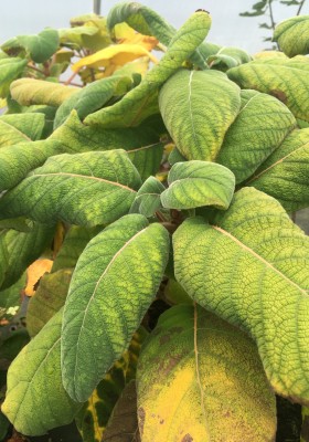 An upright medium-sized deciduous shrub of open habit, with peeling bark and large, velvety ovate leaves. Flowers in large flat heads, purple or blue, surrounded by white ray florets