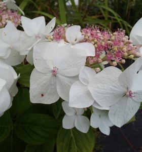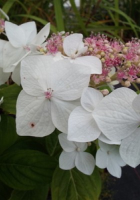 A superb compact shrub with large flattened heads of bright blue or pink fertile flowers surrounded by a ring of pure white ray florets. Grows well in coastal regions.