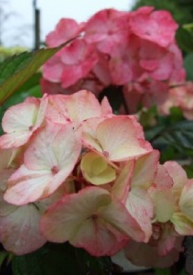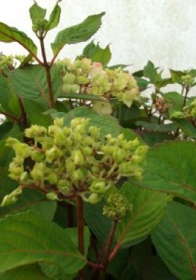 Upright shrub with dark green red veined leaves. Rounded flower heads creamy at first becoming rich red. Grows to a height of approximately 1.5 metres.