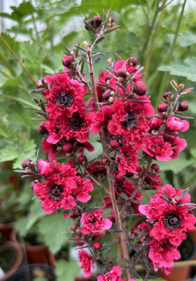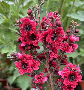 A dense medium-sized evergreen shrub with narrow, dark green leaves. Flowers deep red, fully double, about 12mm in width and very freely borne from late spring