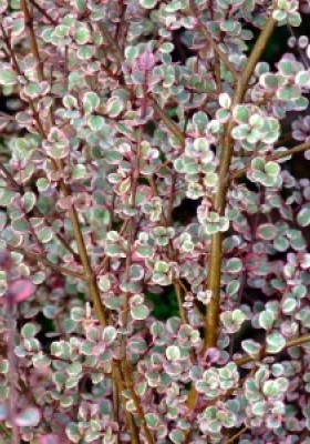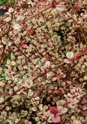 Low growing shrub with small pink white and green leaves on slender stems. Hardy in mild coastal areas - could be grown in a container to protect inside when the weather is at its worst. Very Pretty.