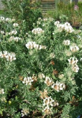 This pretty dwarf evergreen sub-shrub has silvery-hairy foliage and heads of pink tinged-white pea flowers throughout summer and autumn. Requires a well drained position in full sun. Ht.45 - 60cm.