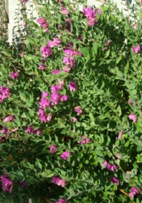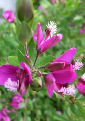 A small evergreen shrub for a sunny site in mild areas of the country. We have grown it for years by a south facing house wall in a miserable dry narrow "builders" border. It flowers nearly all year round. The pea shaped flowers are purple in terminal clusters.