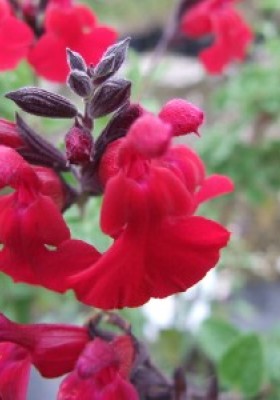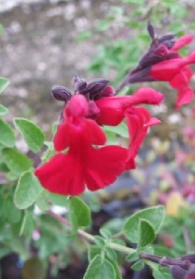 A lovely semi evergreen shrub with aromatic leaves and rich dark crimson-red flowers from June to October.